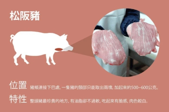 松阪豬又被稱作「黃金六兩肉」,世界上最好吃的豬肉,數量稀少; 因其油花漂亮且均勻分布,如同松阪牛一般,而有了松阪豬的美譽。
